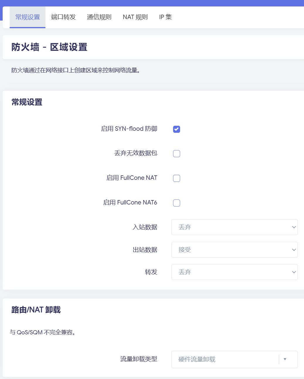 这倒是和我遇到的问题一致。ImmortalWrt(我的版本是24.10.4)的相关设置在防火墙中: